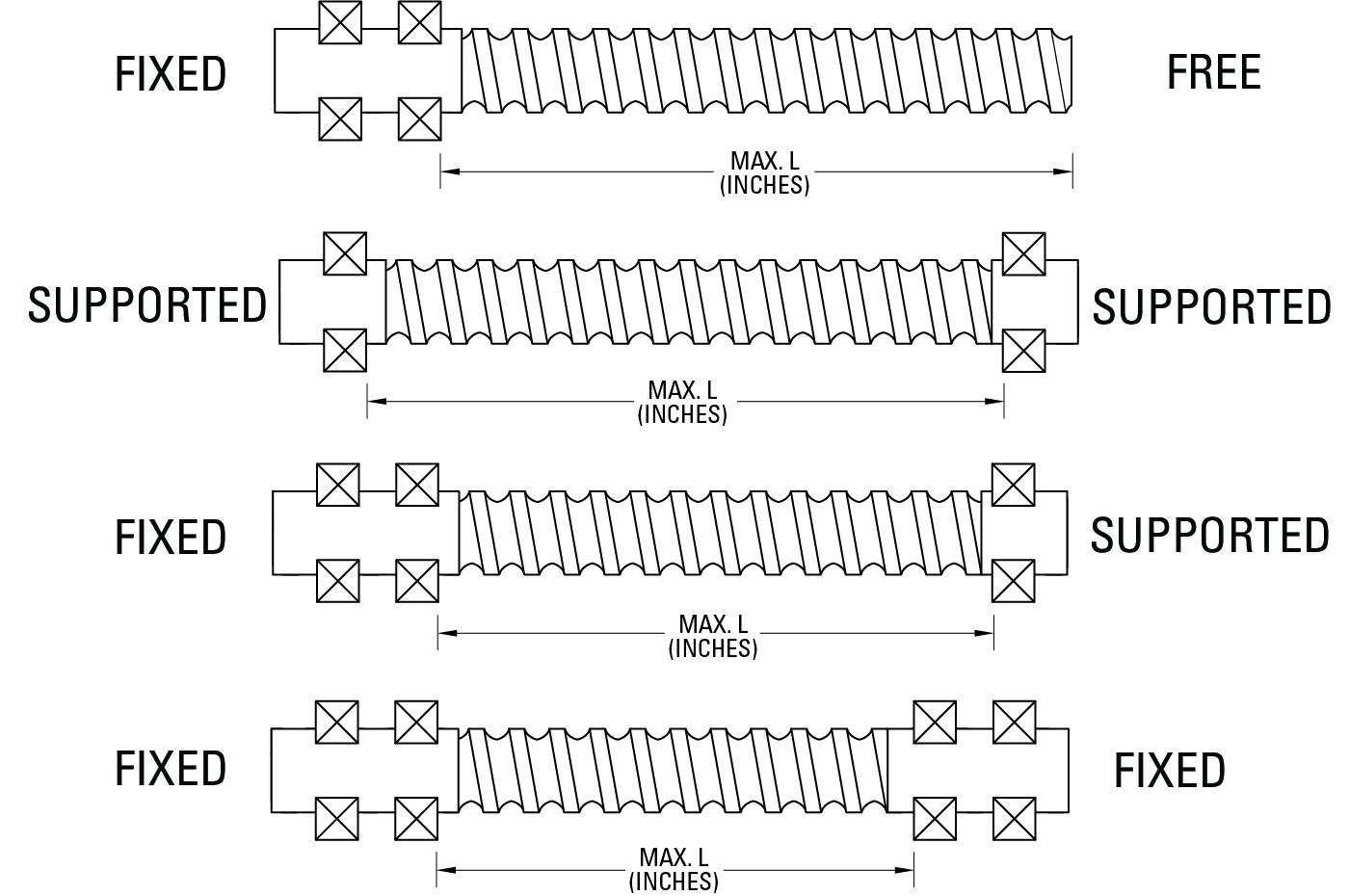Ball screws are mounted in either supported or fixed configurations. A supported end holds the ball screw at one focal point and does not resist bending moments. A supported end is generally easier to align and install than a fixed one, so installation costs are typically lower. A fixed end resists bending moment loads because it is typically based on two bearings spaced sufficiently so the ball screw remains perpendicular to the planes of the rotary bearings. The fixed offers greater column strength and higher critical speed. The image below illustrates four fixity options.