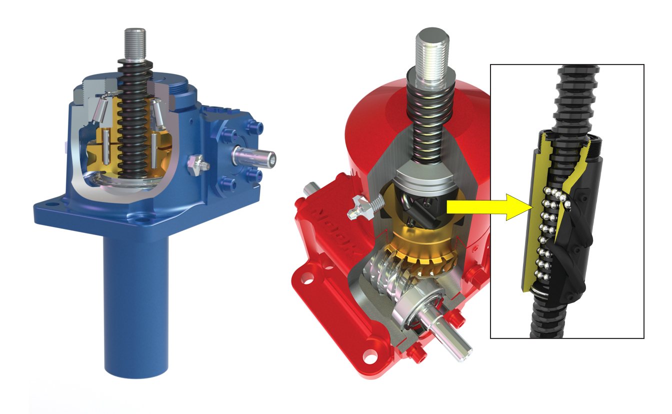 Figure 1. Machine screw jacks (left) use a threaded metal shaft and nut, which is very economical but provides high friction and low efficiency. Ball screw jacks (right) are more expensive, but their use of rolling balls reduces friction and improves efficiency. (Images courtesy of Thomson Industries.)