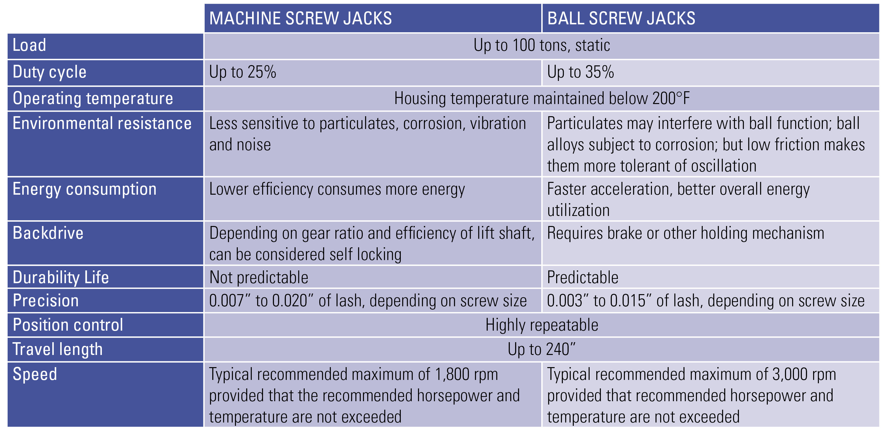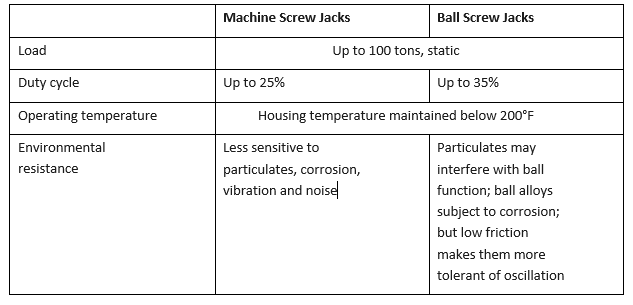 Potential for shock loading should also be considered. Although vendors seldom recommend either machine screw jacks or ball screw jacks for high shock environments, both can temporarily exceed their rated capacity by about 10% for dynamic loads and 30% for static loads.