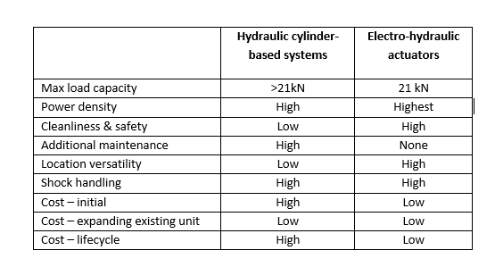 Figure 2: Comparison of hydraulic cylinder-based systems and electro-hydraulic actuators.