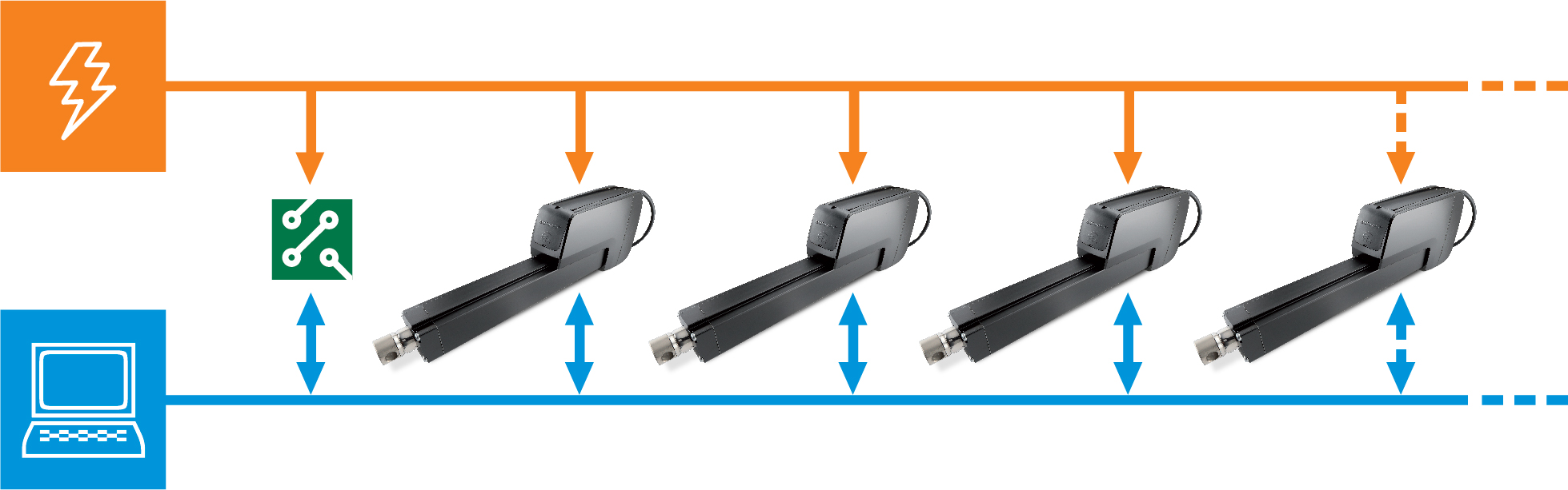 With CAN bus, system developers have much greater flexibility to program the sensors and internal electronics to synchronize operations among multiple actuators. For example, they can program units to vary in speed depending on load or change speed to compensate if units speed up or slow down.